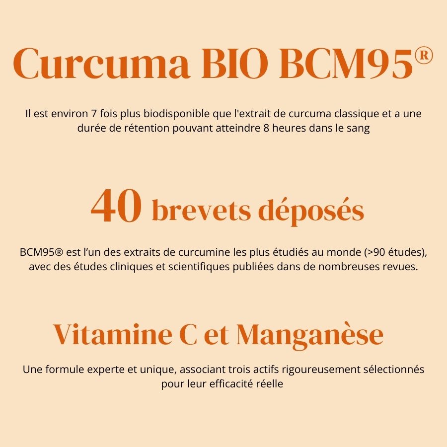 Curcuma BCM95® avec une biodisponibilité 7 fois supérieure, associé à la Vitamine C et au Manganèse pour une action renforcée sur les douleurs articulaires, l’inflammation et le stress oxydatif.