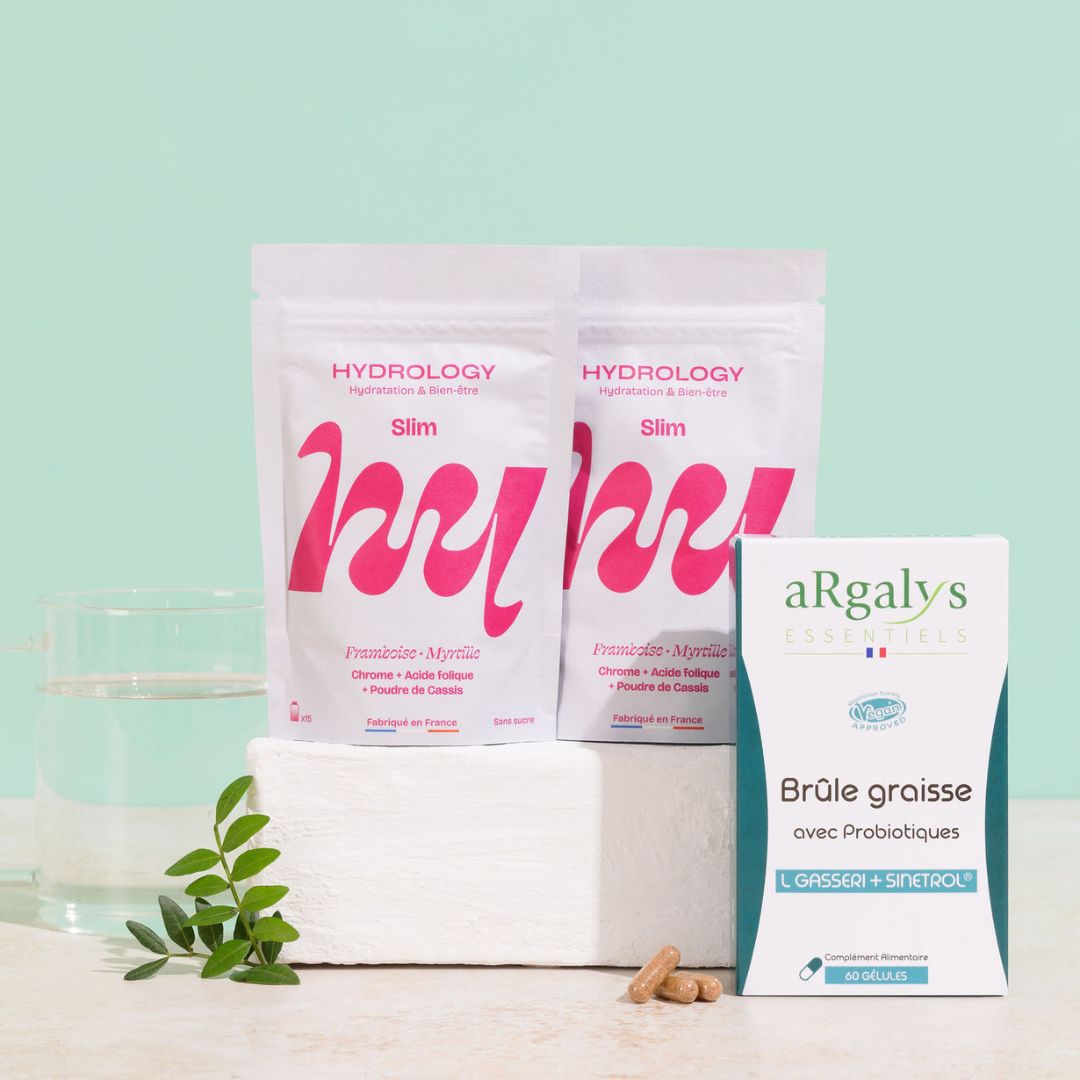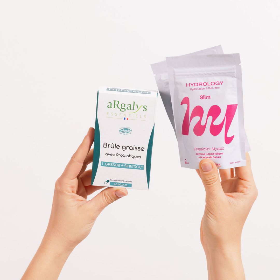 Pour accompagner cette démarche, nous avons associé les pastilles d’hydratation fonctionnelle Slim Hydrology à notre formule Brûle Graisse.