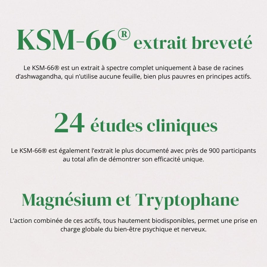 El estrés, la fatiga mental y los trastornos del sueño forman parte de la vida cotidiana de millones de personas. Para ayudarle en su día a día, hemos diseñado una fórmula con extracto de Ashwagandha orgánica etiquetada KSM-66® titulado al 5% en withanolide, magnesio y triptófano.